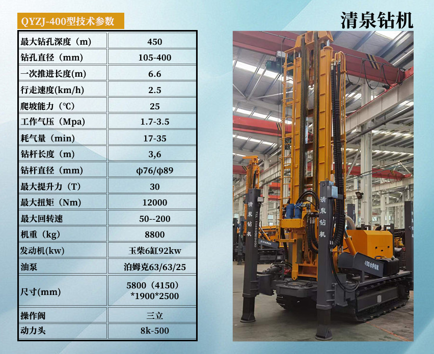 清泉400型潛孔水井鉆機(jī) 發(fā)動(dòng)機(jī)功率:玉柴股份六缸92千瓦。 油泵:美國(guó)泊姆克。 動(dòng)力頭馬達(dá): BM6-390。 最大扭矩: 12000 扭米+ 最大提升力: 30噸。 操作閥:三立。 整機(jī)機(jī)重: 8.8噸。 尺寸:長(zhǎng)5.8米(底長(zhǎng)4.15米),寬1.9米,高2.5米。 鉆孔直徑: 105-400 毫米。 鉆桿直徑:中76/φ89(3米)。 一次性推進(jìn)長(zhǎng)度: 6600 毫米。
